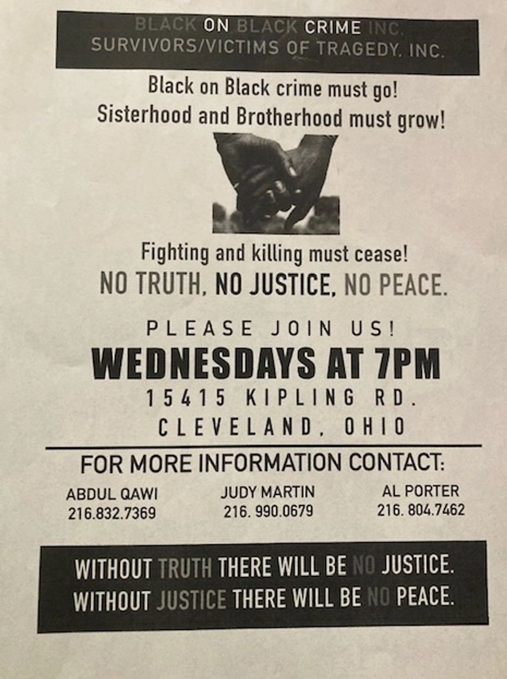 Without truth, there will be no justice. without justice, there will be no peace. Come to our meetings every Wednesday at 7 pm at 15415 Kipling Ave Cleveland Ohio 44110.
